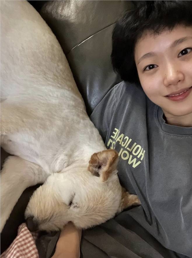 김고은은 편안한 트레이닝 차림으로 반려견과 함께 산책에 나섰습니다.