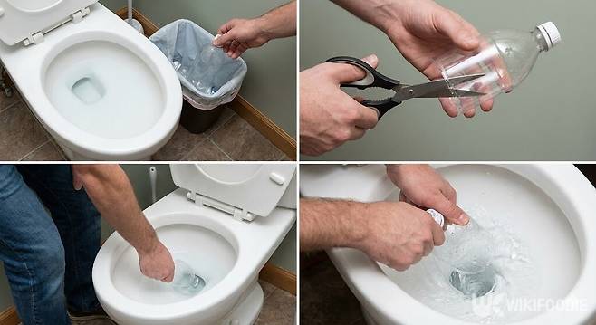변기 뚫는 도구가 없을 때 가장 쉽게 구할 수 있는 물건이 페트병이다. 없다면 재활용 분리수거함을 한 번 살펴보는 것도 방법이다. 이때 단단한 주스 병보다는 콜라나 사이다처럼 손으로 눌렀을 때 잘 휘어지는 페트병이 더 적합하다.
