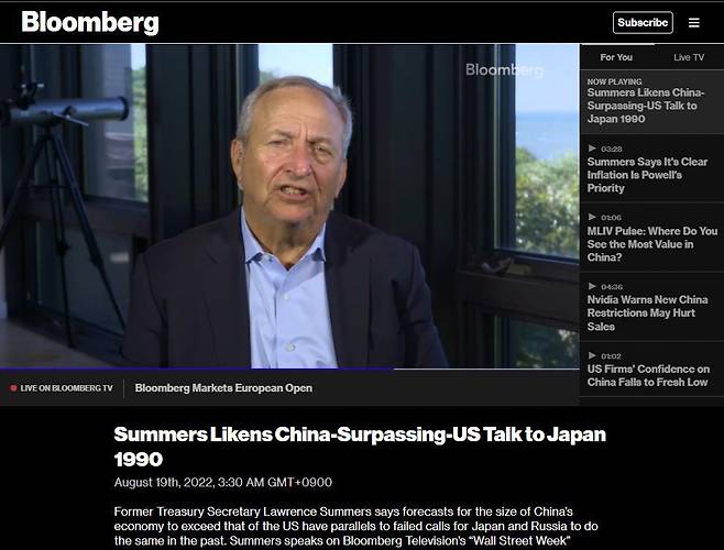 미국 재무장관을 지낸 로런스 서머스 하버드대 경제학 교수는 8월19일 블룸버그 TV 대담에서 “중국이 1960년대 소련이나 1990년대 일본처럼 미국을 넘어서는 데 실패할 것”이라고 예상했습니다. 그는 과도한 금융 부채와 미래 성장 동력이 될 투명성의 부족, 기업 전반에 걸친 공산당의 관여, 생산 가능 인구는 줄고 고령 인구는 급증하는 인구 구조 변화 등을 그 이유로 꼽았어요.