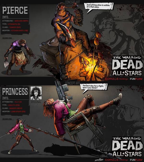 이번 업데이트를 통해 신규 에픽 등급 캐릭터 '피어스'와 '공주'가 등장한다. 피어스는 워킹데드 원작에는 등장하지 않는 '절대악' 성향의 창작 캐릭터다. 무시무시한 식인종으로서 쇠사슬과 중식도를 활용한 연속적인 공격을 통해 적의 핵심 전력을 제압한다. 선 성향의 공주는 워킹데드 원작 후반부에서 인상 깊은 활약을 펼치는 캐릭터다. 기관총을 활용해 다수의 적을 한 번에 상대할 수 있으며 원작의 성격을 반영해 유쾌한 모션으로 생존자 그룹의 분위기를 밝게 이끈다.
