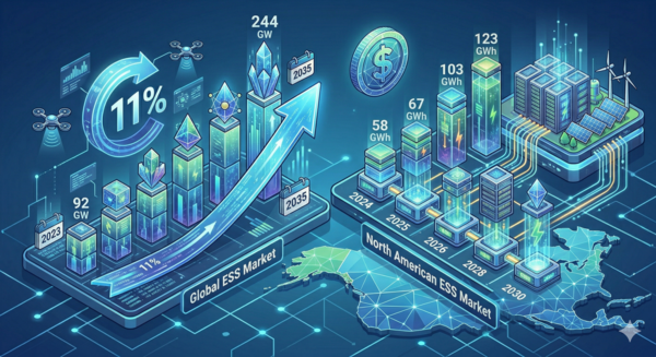 실제로 블룸버그뉴에너지파이낸스(BNEF)에 따르면 글로벌 ESS 설치 용량은 지난해 92GW(기가와트)에서 2035년에 244GW로 확대되며 연평균 약 11% 성장할 것으로 전망된다. 특히 북미 ESS 수요는 2024년 58GWh(기가와트시)에서 2025년 67GWh, 2026년 88GWh로 늘어난 뒤 2028년 103GWh, 2030년에는 123GWh까지 증가할 것으로 전망된다. 데이터센터와 재생에너지 연계 수요가 동시에 확대되면서 북미가 글로벌 ESS 시장 성장을 주도하는 핵심 지역으로 부상한 영향이다.