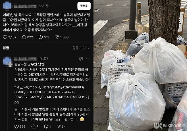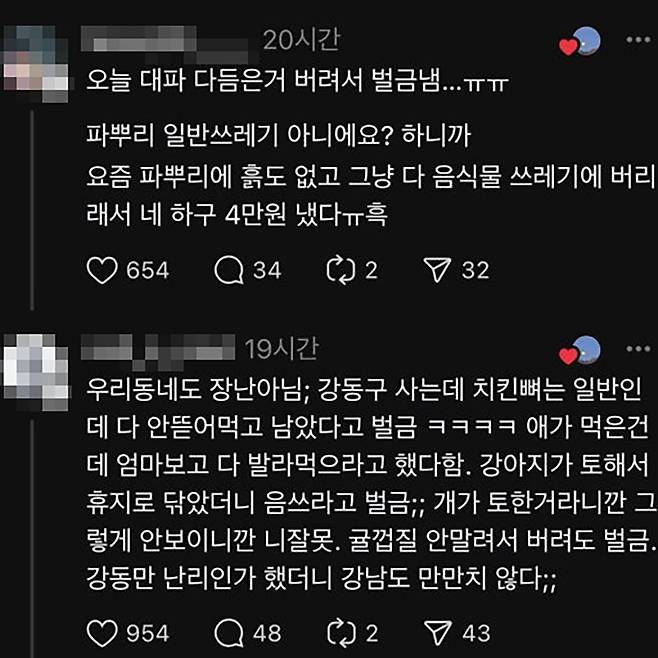 7일 온라인 커뮤니티에는 “고무장갑을 종량제봉투에 넣었는데 과태료가 나왔다. 자치구마다 기준이 다르다고 해서 당황했다”는 글이 올라왔다. 다른 이용자도 “닭뼈에 살이 붙어 있었다며 벌금이 부과됐다”고 전했다.