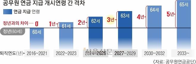 2015년 공무원 연금 개혁으로 연금 수급 개시 연령은 단계적으로 늦춰져 2033년 65세에 도달한다. 반면 공무원 정년은 여전히 60세에 묶여 있다. 이에 따라 소득 공백기는 2024~2026년 2년에서 2027~2029년 3년으로 확대되며 2033년 이후에는 최대 5년까지 벌어진다. 정년과 연금 수급 개시 연령의 불일치는 민간도 겪는 문제지만 퇴직금이 없는 공무원에게 소득 절벽은 더 가파르다.