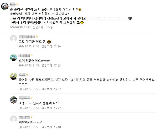 팬들은 "시간까지 맞추시다니 너무 감동이다" "우리가 생각하는 것보다 정말 푸바오를 사랑하시는 것 같다" "항상 눈물이 납니다" "응원합니다"라는 반응을 보였습니다.