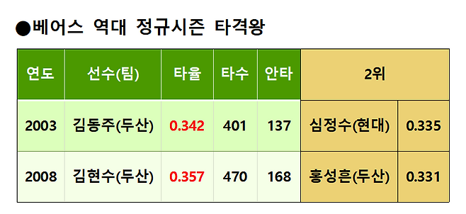 다시 정리하자면 베어스 구단 역사상 소속 선수가 타격왕을 차지한 것은 2003년 김동주와 2008년 김현수 단 2번뿐이다.