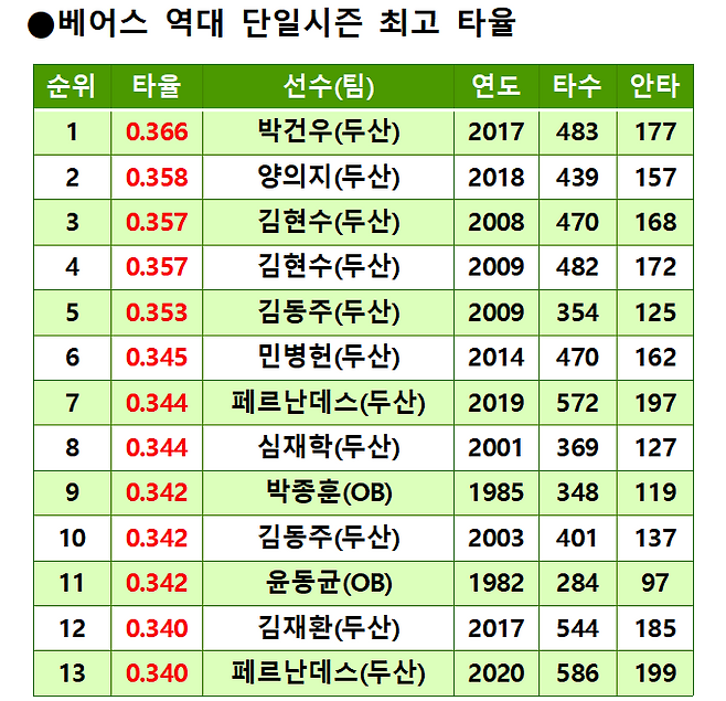 한편 타격왕과 상관없이 역대 베어스 소속 타자 중 단일시즌 최고 타율을 올린 선수는 2017년의 박건우(0.366)다. 이 부문 베어스 역대 2위는 2018년 양의지의 0.358이다.