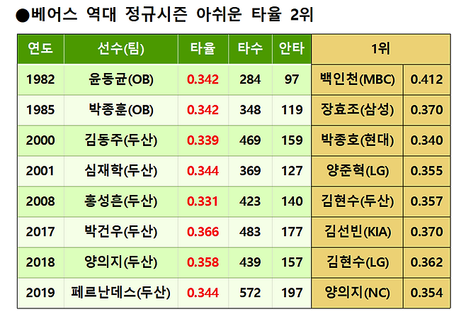 2019년에는 두산 외국인타자로 영입된 호세 미구엘 페르난데스가 타격 2위라는 아픈 징크스를 이어갔다. 공교롭게도 그해 타격 1위는 NC로 이적한 양의지(0.354)였다. 양의지는 2018년 두산에서 맺혔던 타격왕의 한을 NC에서 풀었지만, 두산은 3년 연속 타격 2위를 배출(?)하는 비운을 맛봤다.