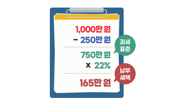 연간 양도차익이 1,000만 원이라면 양도소득 기본공제 250만 원을 차감한 후 750만 원이 양도소득 과세표준이 됩니다.