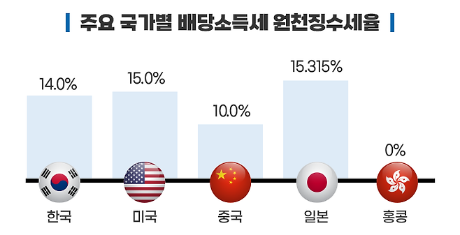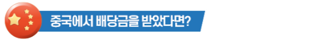 중국은 배당금에 대해 10%로 원천징수를 하기 때문에, 국내 원천징수세율(14%)과의 차액인 4%에 지방소득세(소득세의 10%)를 합산한 4.4%를 국내 금융회사에서 추가로 원천징수 합니다.