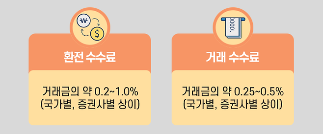 해외주식에 투자할 때 원화로 할 수 없기 때문에 현지 화폐로 환전을 해야 합니다. 이때 거래금의 약 0.2~1.0%의 수수료가 붙습니다. 이 수수료는 국가별, 증권사별로 다릅니다.