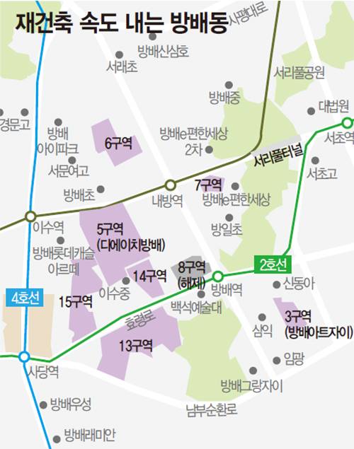방배동 일대에는 5·6·15구역 외에도 7·13·14구역 등 다양한 정비사업이 진행되고 있다.