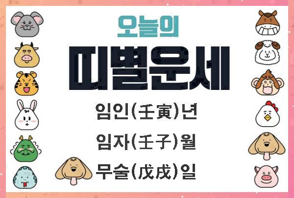 Today's fortune is published everyday, at 9:00 PM the night before2022년(단기 4355년) 12월 11일 일요일 (음력 11월 18일) "더사주" 띠별 운세오늘은 임인(壬寅)년, 임자(壬子)월이고, 일진(日辰)은 무술(戊戌)입니다.오늘 나의 운은 좋을까? 아니면 나쁠까? 누구나 한번쯤은 가져보는 의문이다. '더사주'의 도움으로 이러한 궁금증을 풀어본다.어렸을때 부모님, 혹은 조부모님으로부터 "오늘은 일진이 사나운 날이니 매사 조심해야 한다"는 말을 한두번쯤은 들었던 기억이 있을 것이다. 하루 하루 자식, 손주의 안위를 염려하는 깊은 사랑의 표현이지만 젊었을땐 대수롭지 않게 여겼을 수도 있는데 막상 나이를 먹고 자식을 키우다보면 그때서야 비로소 '그런 말을 할때의 그 간절했던 마음'을 속깊이 이해하게 된다. 여기서 말하는 "일진(日辰)"이 바로 "오늘의 운세"다.사주/운세/궁합 등은 단순히 '호기심이나 재미'가 아니라 '모르는 것보다는 알고 조심하고 현명하게 행동하기 위해 참고해야 할 식견'으로 인식되고 있는 만큼 미리 체크해 두면 하루 24시간, 시간의 주인이 될 수도 있지 않을까?'오늘의 운세'를 챙겨 본다는 것은 '나를 사랑한다'는 뜻입니다. 이는 오늘의 '나'를 더 나은 내일의 '나'로 만들고자 하는 '나를 사랑하는 마음'이 있기 때문입니다.Taking care of 'Today's fortune' means 'love myself'.