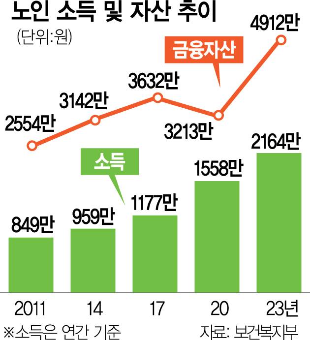 자산 수준도 대폭 상승한 것으로 나타났습니다. 지난해 노인층의 평균 금융자산은 4912만 원으로 2020년(3213만 원)에 비해 53% 증가했습니다. 같은 기간 부동산 자산 규모는 2억 6183만 원에서 3억 1817만 원으로 늘었습니다. 부동산 자산은 자가를 비롯한 소유 부동산에 전세금까지 포함한 개념입니다.