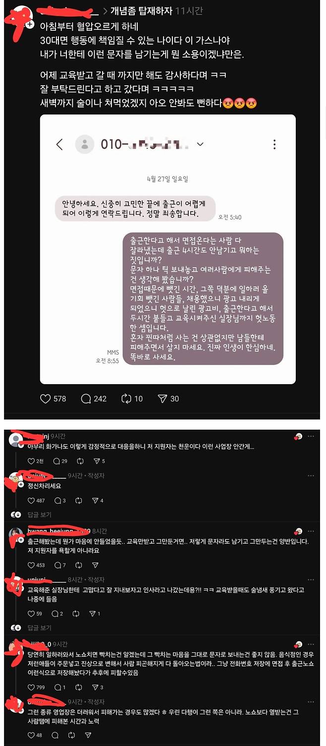 출근 4시간도 안 남은 상태에서 저런 문자 보냈다고 함