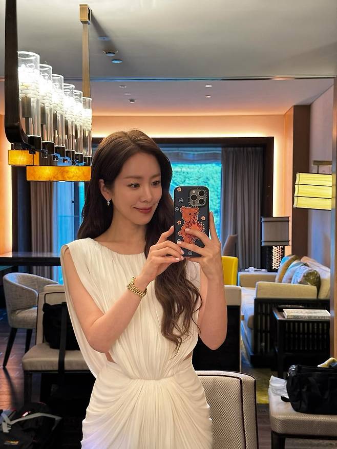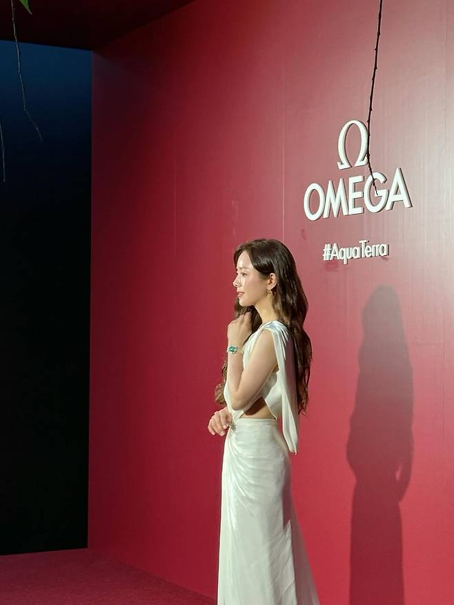 드레스는 허리 라인이 살짝 드러나는 컷아웃 디테일로 우아함과 트렌디함을 동시에 살렸으며, 그녀의 긴 웨이브 헤어와 자연스러운 메이크업이 어우러져 기품 있는 분위기를 더했다.