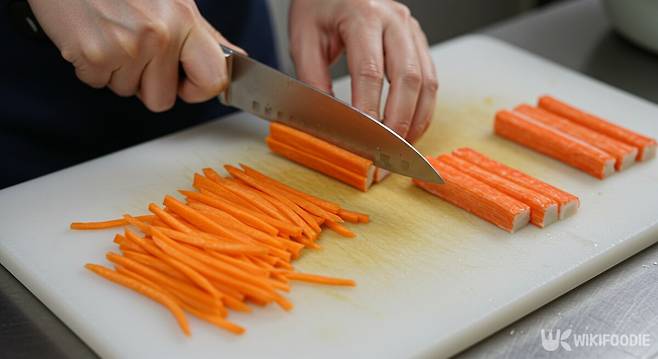 먼저, 당근을 채 썬 후 맛살은 길게 2등분한다. 그다음 볼에 달걀 10개와 소금 2티스푼을 넣고 섞어준다. 밥 1.5kg에는 마요네즈 250g과 맛소금 15g을 넣고 잘 섞어 맛을 내자. 이 밥에 마요네즈가 더해지면 김밥의 밥맛이 더욱 부드럽고 고소해진다.