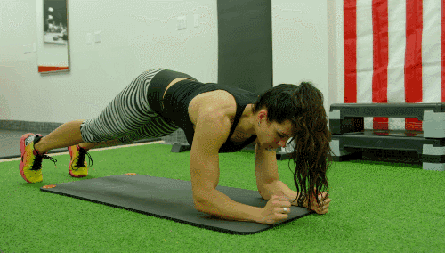 매트에 팔뚝을 대고 엎드려 팔꿈치 플랭크 자세로 시작합니다. 먼저 오른쪽 팔꿈치를 펴 손바닥으로 짚고, 이어서 왼쪽 팔꿈치도 펴 플랭크 기본자세로 전환합니다. 이후 다시 오른쪽 팔꿈치를 구부려 팔꿈치 플랭크로 내려오고, 왼쪽 팔꿈치도 구부려 처음 자세로 돌아옵니다.