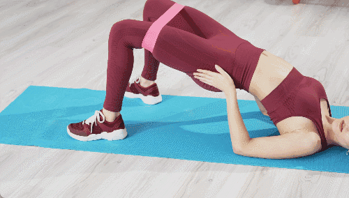 매트에 등을 대고 누운 상태에서 허벅지 사이에 밴드를 끼웁니다. 무릎을 세우고 발을 바닥에 붙인 뒤 엉덩이를 들어 브릿지 자세를 유지합니다. 이 상태에서 다리를 좌우로 벌렸다 오므리는 동작을 반복합니다.