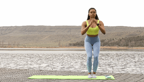 매트 위에 발을 모은 상태로 서서 시작한 뒤, 무릎을 굽혀 기본 스쿼트 동작을 진행합니다. 이어서 오른발을 오른쪽으로 이동하며 스쿼트를 반복하고, 다시 오른발을 넓게 벌려 스쿼트를 이어갑니다.