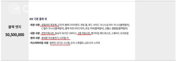 트림별 실제 계약자 선택 비율은 MX 트림이 45%, 블랙 엣지 55% 선택률을 보였다. 두 트림 차이는 크지 않은 편으로 고른 선택을 보인 점이 특징이다. 그 이유를 살펴보면 MX 트림에도 안전, 편의 사양이 대부분 기본으로 적용되어 있어 기능상 차이가 크지 않다.