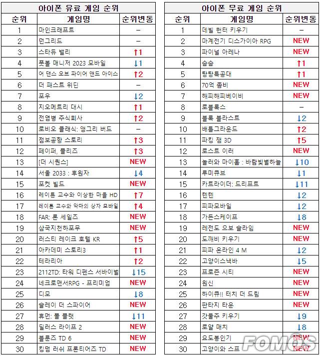 새로운 게임의 차트 진입과 함께 지난주 인기 게임은 하락세를 보였다.