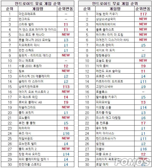 유료 게임 순위에서는 '마인크래프트'와 '던그리드'가 각각 1위와 2위 자리를 지켰다.