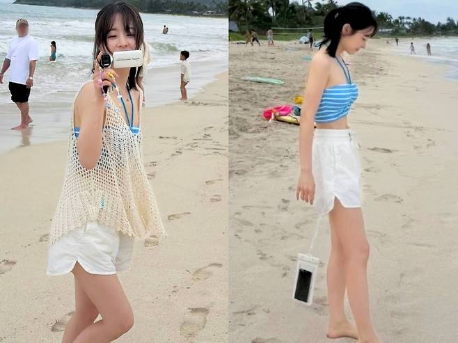 여기에 짧고 산뜻한 화이트 쇼츠를 더해 발랄한 실루엣을 강조했고, 맨발로 해변을 걷는 모습은 꾸밈없는 자유로운 분위기를 배가했습니다.