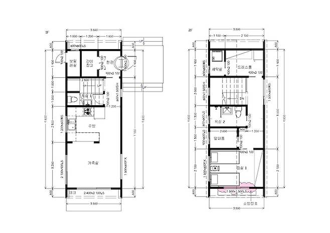 저희 집의 '진짜진짜최종.jpg' 도면이에요.ㅎㅎ 그리 크지 않은 땅에 두 채의 집을 짓다 보니 건축 면적에 제한이 많아서 집 크기는 포기해야 했어요. 부모님과 함께 집을 짓기로 결정한 순간부터 부모님 집을 36평, 저희 집을 22평으로 픽스하고 자세한 설계를 해나갔습니다. 워낙 작은 면적인지라 높은 층고나 탁 트인 전망, 화려하고 멋진 디자인은 꿈꿀 수 없었고요 그저 작지만 있을 건 다 있는 알찬 집 만들기에 최선을 다했습니다.