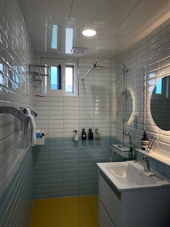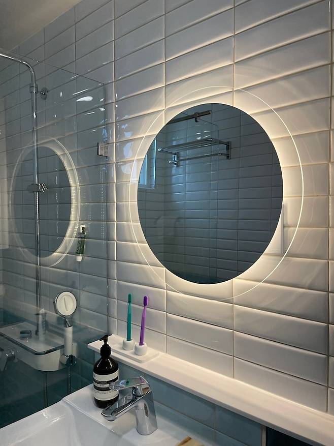 전면에는 LED 거울을 설치했어요. 아파트에서 늘 사용하던 커다란 거울이 달린 상부장과는 다른 느낌을 주고 싶었습니다. 욕실 용품 수납은 거울 옆쪽으로 슬림한 상부장을 달고, 하부장이 있는 세면대를 설치하여 넉넉히 소화하고 있어요!