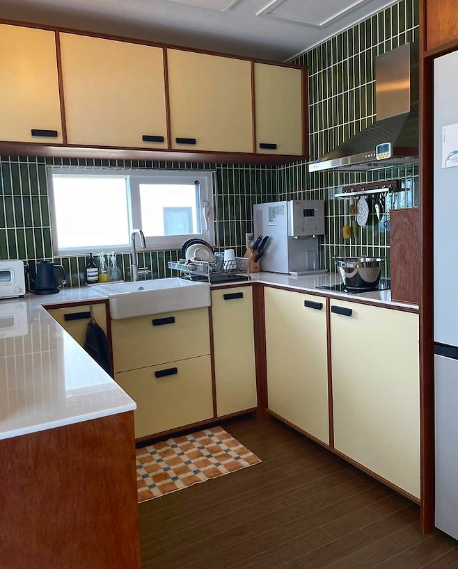작고 아기자기한 저희 집 주방입니다. 집을 설계하고 인테리어하며 가장 많이 고민하고 공을 들인(비용을 지불한) 공간이기도 해요. 빈티지한 느낌의 원목 주방을 만들기 위해 정말 다양한 사진 자료와 시공 업체를 찾아보았던 기억입니다. 시공하며 이런저런 우여곡절을 겪었지만 결과적으로 마음에 쏙 드는 하나뿐인 주방을 만나게 되어 아직도 주방에 들어설 때마다 기분 좋고 뿌듯해요.
