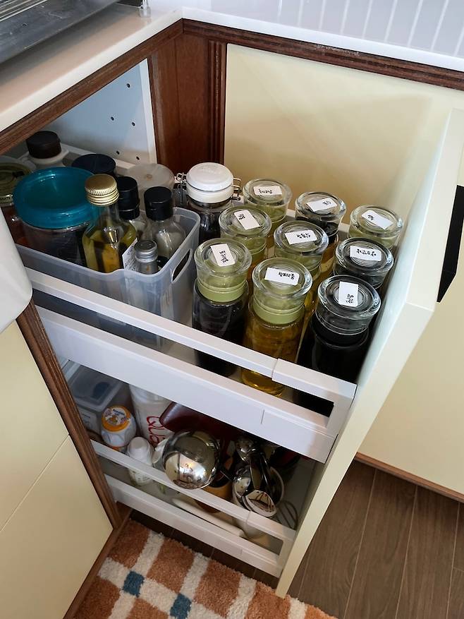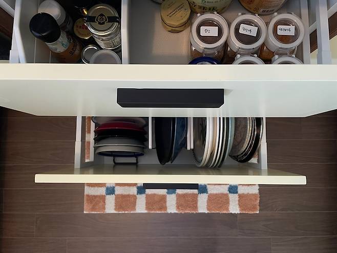 많은 주방 살림들을 수납하려다 보니 깔끔하고 효율적인 정리가 필수였습니다. 오늘의집에 올라온 정리 고수들의 다양한 팁들을 연구하며 참 많은 도움을 받았어요! 특히나 슬라이딩 서랍에 접시를 세워 보관하는 것과 밀폐용기의 뚜껑과 본체를 따로 분리하여 보관하는 것이 지금 사용하면서도 참 편리하고 만족스러운 부분이에요. :)