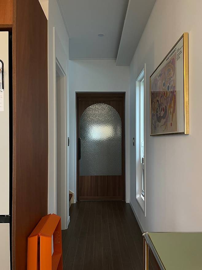 1층 복도 끝에 보이는 중문의 모습입니다. 마루와 최대한 컬러를 맞춰 짙은 우드 톤으로 제작했어요.