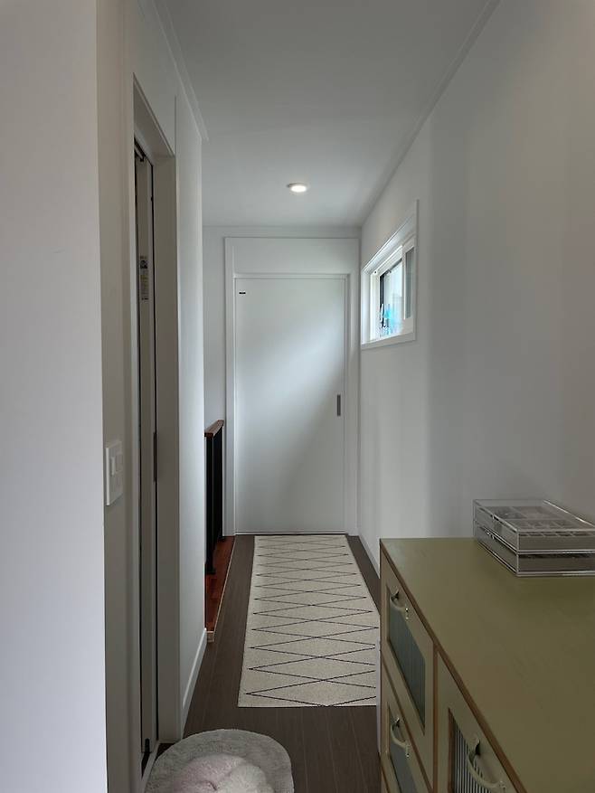 중문을 열면 보이는 공간입니다. 직사각형 집이라 입구부터 시선이 쭈욱 따라 들어가는 식의 구조예요. 개인적으로 짙은 색 마루를 선호하는 편인데, 주로 오크나 회 베이지 톤으로 시공된 신축 아파트에서 살다 보니 내 집을 짓거나 인테리어를 하면 꼭 어둡고 짙은 색의 마루로 해야겠다 생각하곤 했었어요. 집이 작다 보니 주변의 모두가 밝은 색 마루를 추천했지만 남편과 저의 의지대로 한솔마루의 짙은 컬러로 결정한 것에 매우 만족합니다!