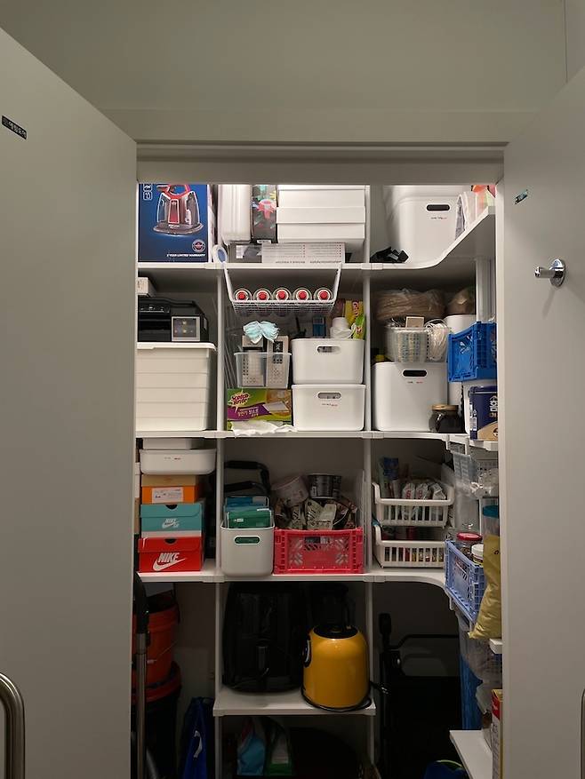 이렇게 많은 것들이 차 있습니다. ㅎㅎ 너무 정신없이 지저분해서 공개하기 망설여졌던 현관 팬트리예요.