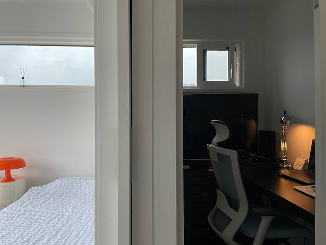 바로 저희 남편의 '로망방'이에요. 어디엔가 콕 박혀서 생각할 시간이 많이 필요한 남편을 위해 작지만 남편만을 위한 감옥(?) 같은 공간을 짜 넣었는데요, 한쪽 벽에 커다란 티브이를 놓고 영화도 보고 게임도 하며 행복해하는 남편을 볼 때면 만들어주길 아주 잘 했다는 생각을 합니다.