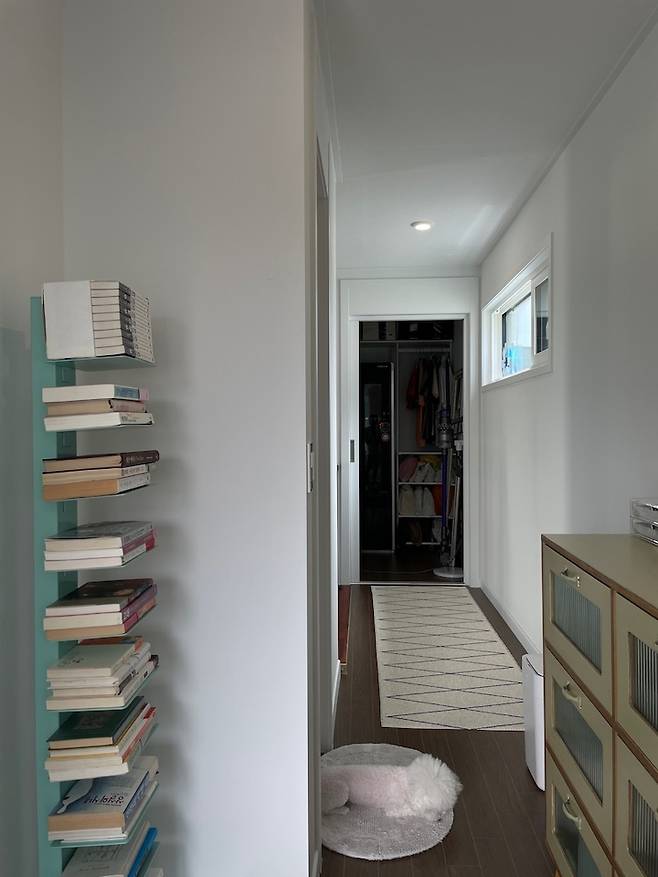 한쪽 벽엔 무인양품 sus 선반을 놓고 책을 수납했어요. 집이 1, 2층으로 구분되어 있다 보니 책을 거실 가까이 두지 않으면 손이 닿지 않을 것 같아 1층 테이블 옆에 책들을 놓았어요. 하지만 역시나 책은 잘 읽게 되지 않습니다. ㅎㅎㅎ
