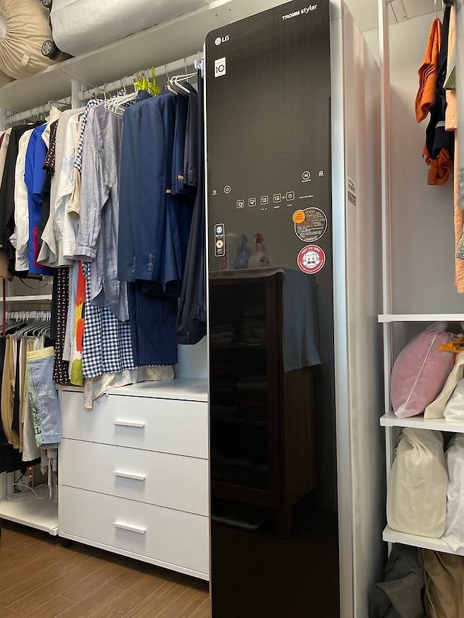 드레스룸 안쪽엔 세탁실이 위치하고 있어요. 기존에 사용하던 18kg짜리 세탁기가 들어가지 않아 세탁실 공간에 맞춰 세탁기를 줄였....답니다. ㅎㅎ 앵글을 별도로 셀프 설치하여 건조기와 직렬로 사용 중이에요!