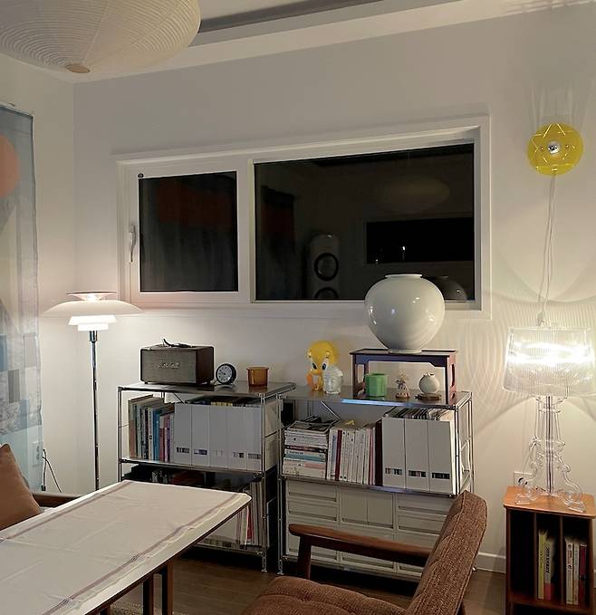 조도가 낮은 걸 선호하는 편이라 거실엔 간접등과 펜던트 조명만 설치했습니다. 그마저도 좀 밝다고 느껴져서 저녁엔 주로 스탠드 두 개만 켜고 생활하고 있어요. 은은한 불빛이 무언가에 집중하기 딱 좋더라고요. 주로 TV 시청에 최적화되어 있긴 하지만요.^^