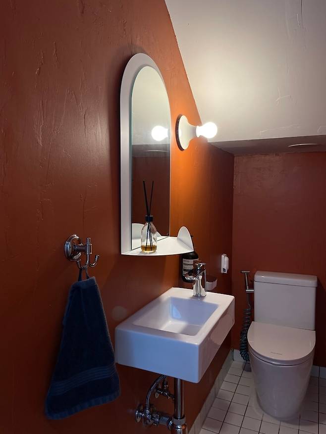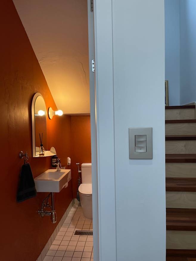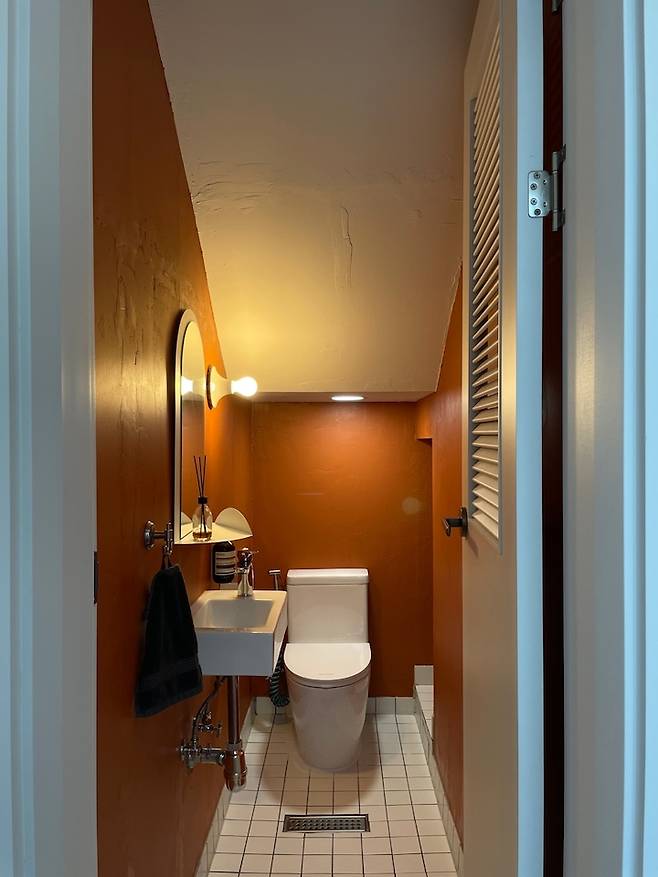 계단 아래 생기는 자투리 공간을 화장실로 설계했는데요, 아주 작은 공간이라 재미있고 특별한 느낌을 줄 수 있으면 했어요. 빈티지한 느낌을 살리기 위해 퍼티도 덕지덕지 발라보고 땀 줄줄 흘리며 페인트도 직접 칠했던 기억이 생생합니다.
