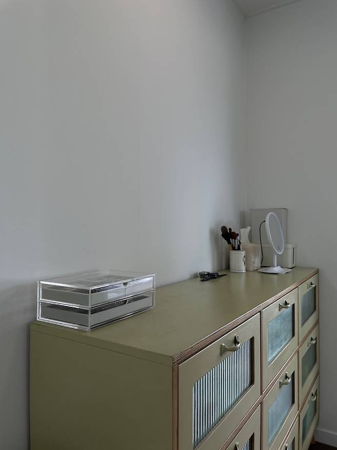 복도엔 옷장 겸 화장대로 사용하는 수납장이 있어요. 결혼할 때 엄마가 그릇장으로 선물해 주신 건데, 만듦새가 좋아서 여태 튼튼하게 잘 살아남아 있답니다. 이젠 나름의 세월과 손때를 타고 이리저리 찍히고 지저분해졌지만 함께한 세월의 흔적이 더해지니 더욱더 애정이 가는 가구예요.^^