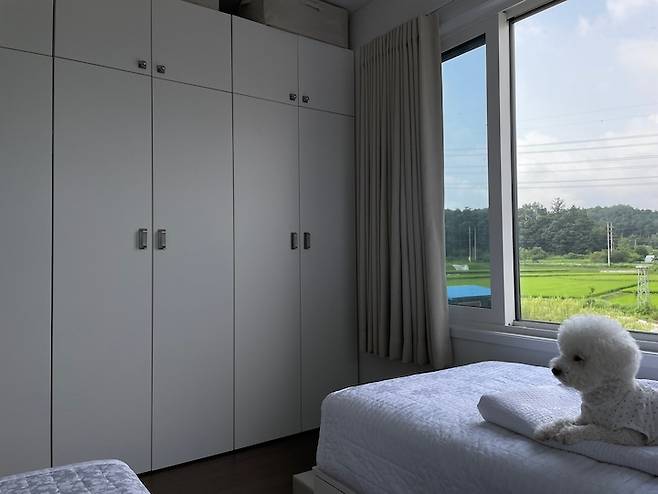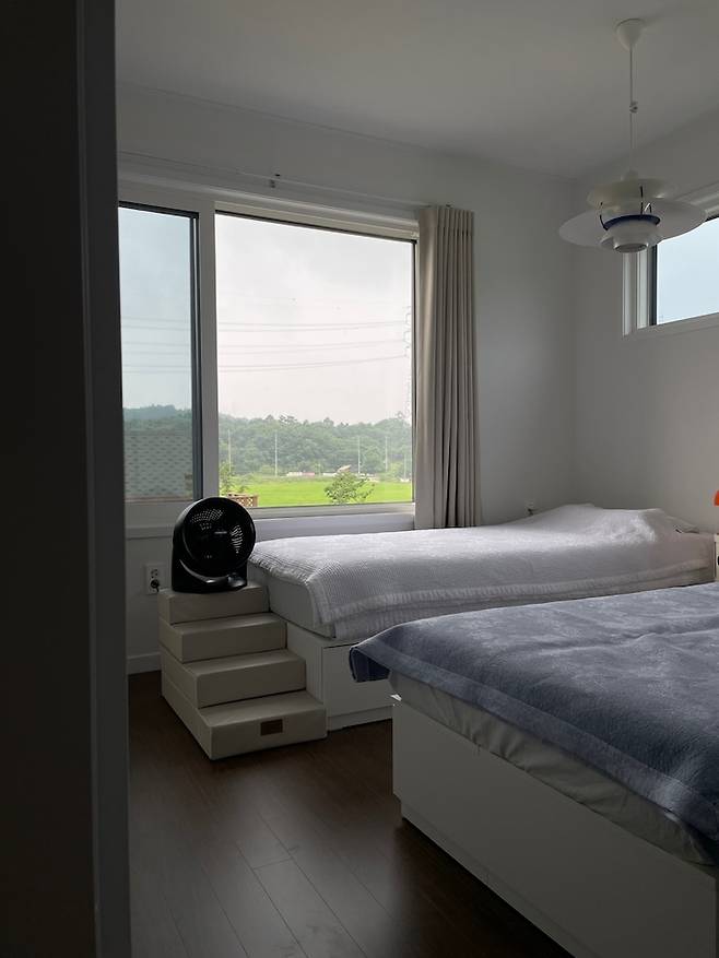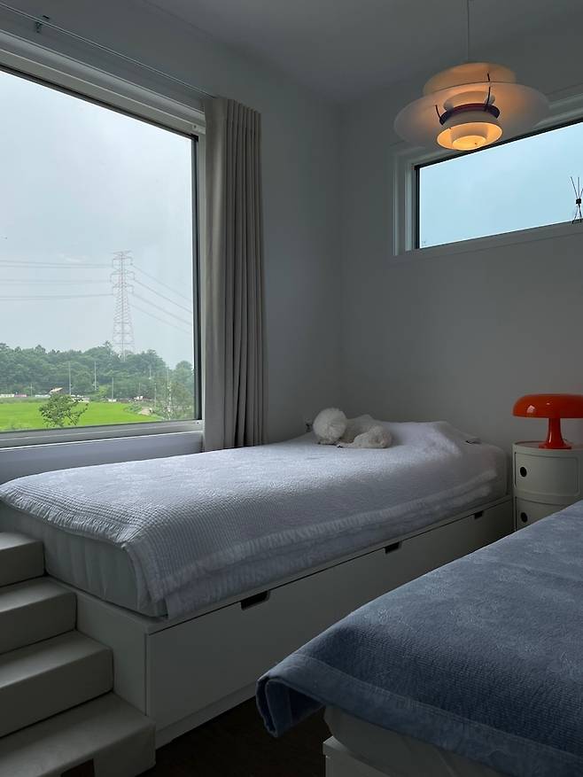 창밖으로 보이는 푸른 풍경이 참 좋은 여름의 침실이에요.