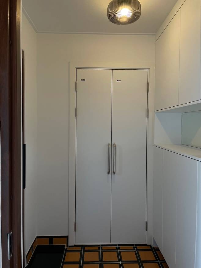 현관문을 열면 오른 편에는 신발장, 정면에는 창고 겸 팬트리가 있는데요, 지네처럼 신발이 많았던 저희 부부는 신지 않는 신발을 줄이고 또 줄여 신발장에 모두 수납하는데 성공했어요! 그리고 정면에 보이는 창고를 팬트리로 사용하여 자잘한 살림들과 주방 집기들을 보관하고 있습니다. 현관 팬트리는 만들기 정말 잘했다고 스스로 칭찬하는 공간 중 하나예요!
