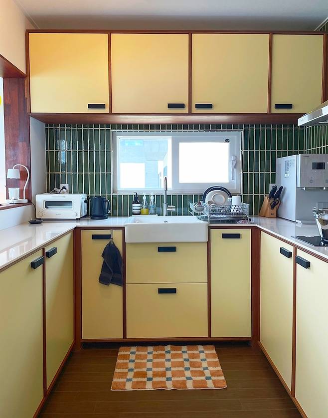 작고 아기자기한 저희 집 주방입니다. 집을 설계하고 인테리어하며 가장 많이 고민하고 공을 들인(비용을 지불한) 공간이기도 해요. 빈티지한 느낌의 원목 주방을 만들기 위해 정말 다양한 사진 자료와 시공 업체를 찾아보았던 기억입니다. 시공하며 이런저런 우여곡절을 겪었지만 결과적으로 마음에 쏙 드는 하나뿐인 주방을 만나게 되어 아직도 주방에 들어설 때마다 기분 좋고 뿌듯해요.