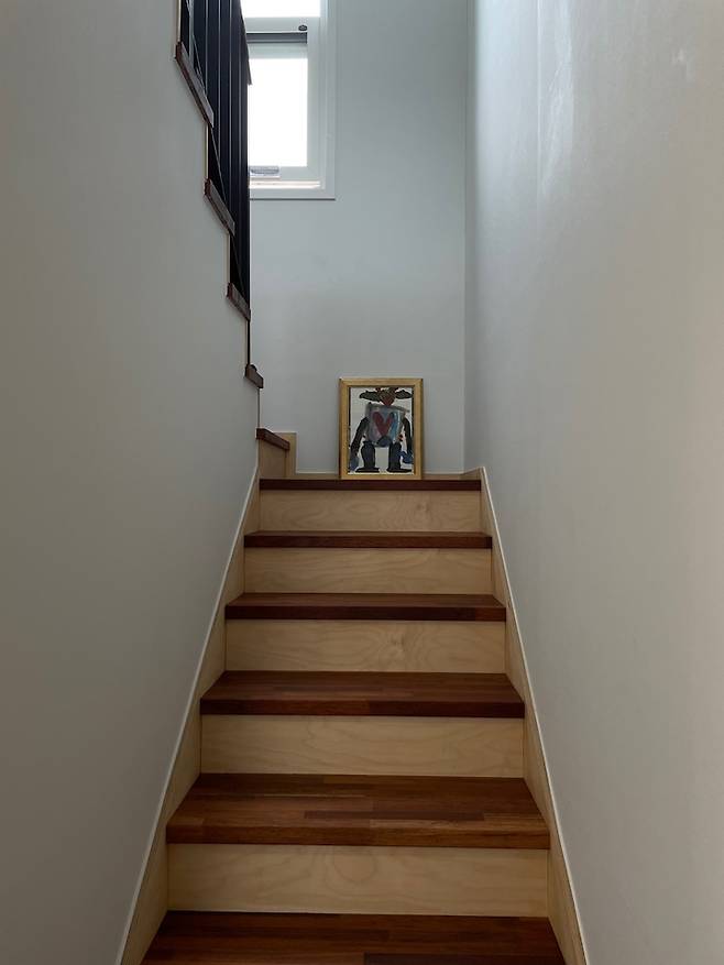 계단 위에는 제가 가르치는 꼬마 화가가 선물해 준 저희 집의 수호신 태권브이가 있어요. 볼 때마다 왠지 힘이 나는 사랑스러운 그림입니다.