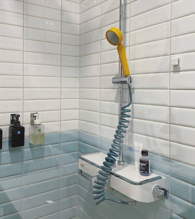 우리 집 화장실과 잘 어울릴 것 같다고 선물 받은 샤워기와 호스예요! 타일 컬러와 찰떡으로 잘 어울려서 보기만 해도 상큼해지는 아이템입니다.