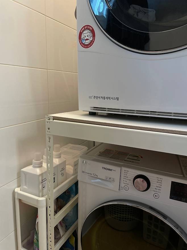 드레스룸 안쪽엔 세탁실이 위치하고 있어요. 기존에 사용하던 18kg짜리 세탁기가 들어가지 않아 세탁실 공간에 맞춰 세탁기를 줄였....답니다. ㅎㅎ 앵글을 별도로 셀프 설치하여 건조기와 직렬로 사용 중이에요!