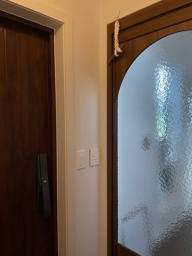 현관 중문은 현관문과 바닥재의 톤과 맞춰 우드 중문으로 제작했어요. 실제 원목은 아니고 우드 시트지를 붙여 제작된 중문입니다. :)