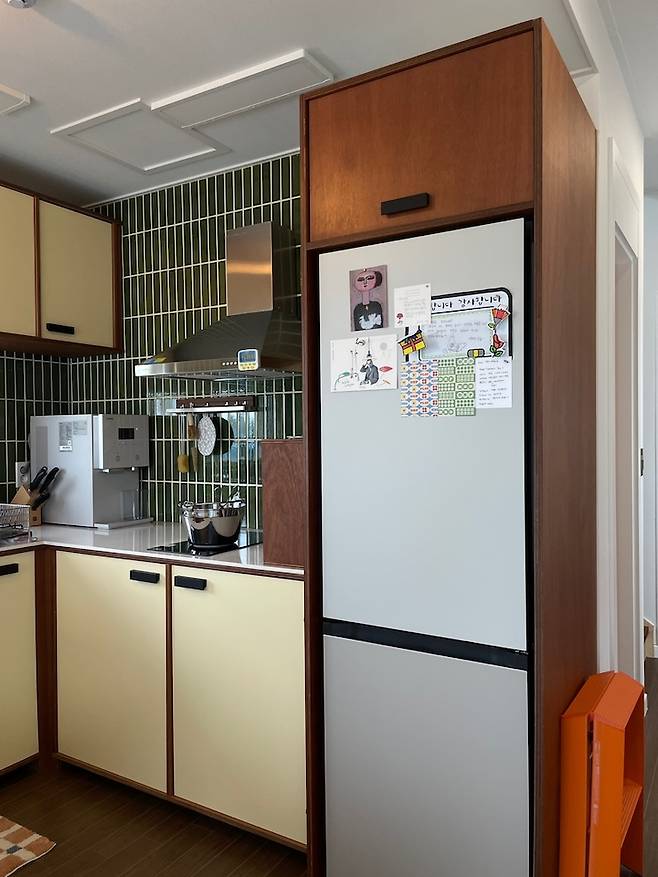 저희는 결혼 8년 차이다 보니 살림들이 상당했는데요, 온온재의 작은 공간에 맞추기 위해 제2의 혼수를 준비하듯 많은 가전과 가구를 교체했답니다. 기존에 쓰던 4도어 냉장고가 들어오기엔 주방이 많이 협소해서 2도어 냉장고로 바꾸었어요. 사용하던 냉장고는 집 뒤편 창고에 넣어두고 식료품 창고처럼 사용 중입니다.
