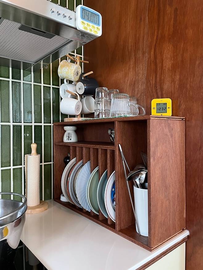 주방 시공업체에서 만들어주신 접시꽂이는 생각보다 쓰임새가 좋아 아주 요긴하게 사용 중입니다.