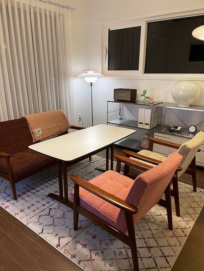 거실에 커다란 소파를 놓고 TV 보는 걸 즐기는 남편과, 커다란 테이블과 의자를 놓고 다이닝 공간으로 사용하고자 했던 저의 의견을 조율하여 찾은 합의점이 바로 지금의 모습입니다.